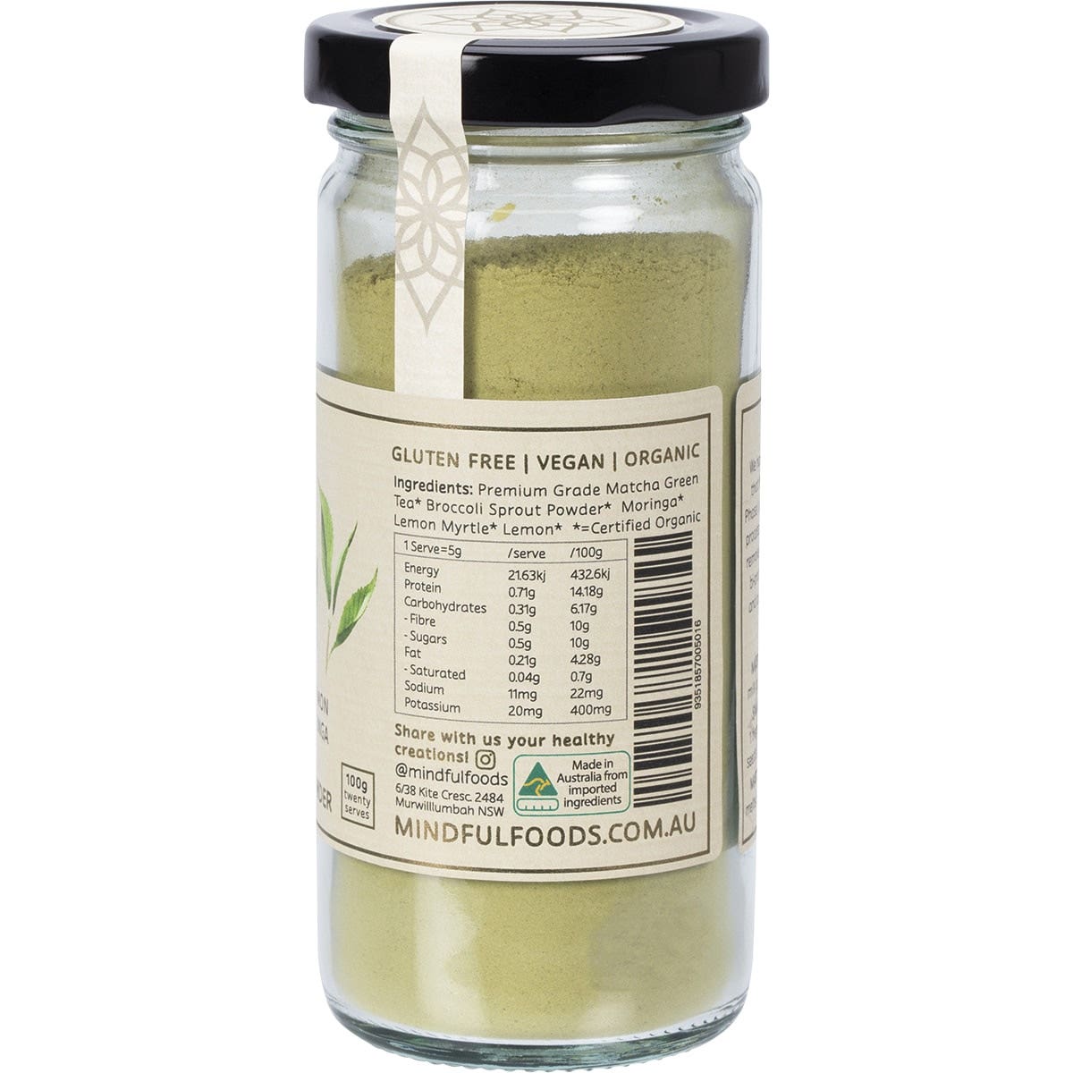Premium Grade Matcha Green Tea*, Broccoli Sprout Powder*, Moringa*, Spirulina*, Lemon*. *Certified Organic Ingredient.