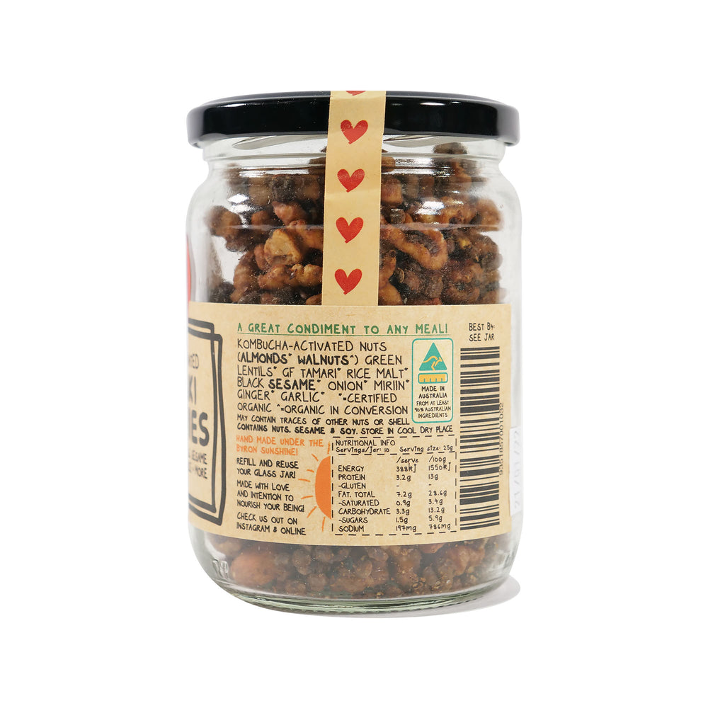 Kombucha-activated almonds, cashews and crunchy lentils coated in Mindful-Made teriyaki sauce. We have used locally grown garlic and ginger to spice up this blend – because fresh is always best! They’ll satisfy your Umami cravings – without having to tuck into a pack of chips!