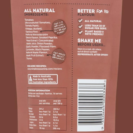 Tomatoes (Reconstituted Tomatoes, Tomato Paste), Vinegar, Mustard, Tapioca Flour, Natural Worcestershire Sauce Flavour, Smoked Paprika, Yeast Extract, Apple Juice Concentrate, Onion Powder, Garlic Powder, Flaxseed Fibre, Coriander, Black Pepper, Natural Maple Flavour, Monk Fruit Extract, Thyme.CPP