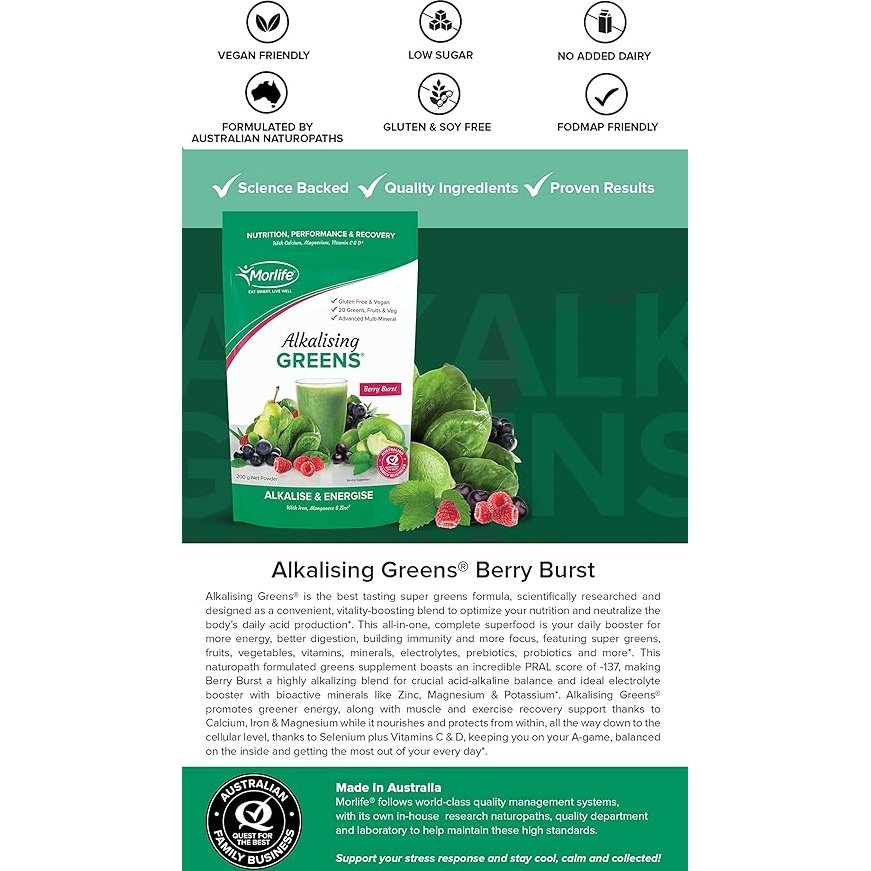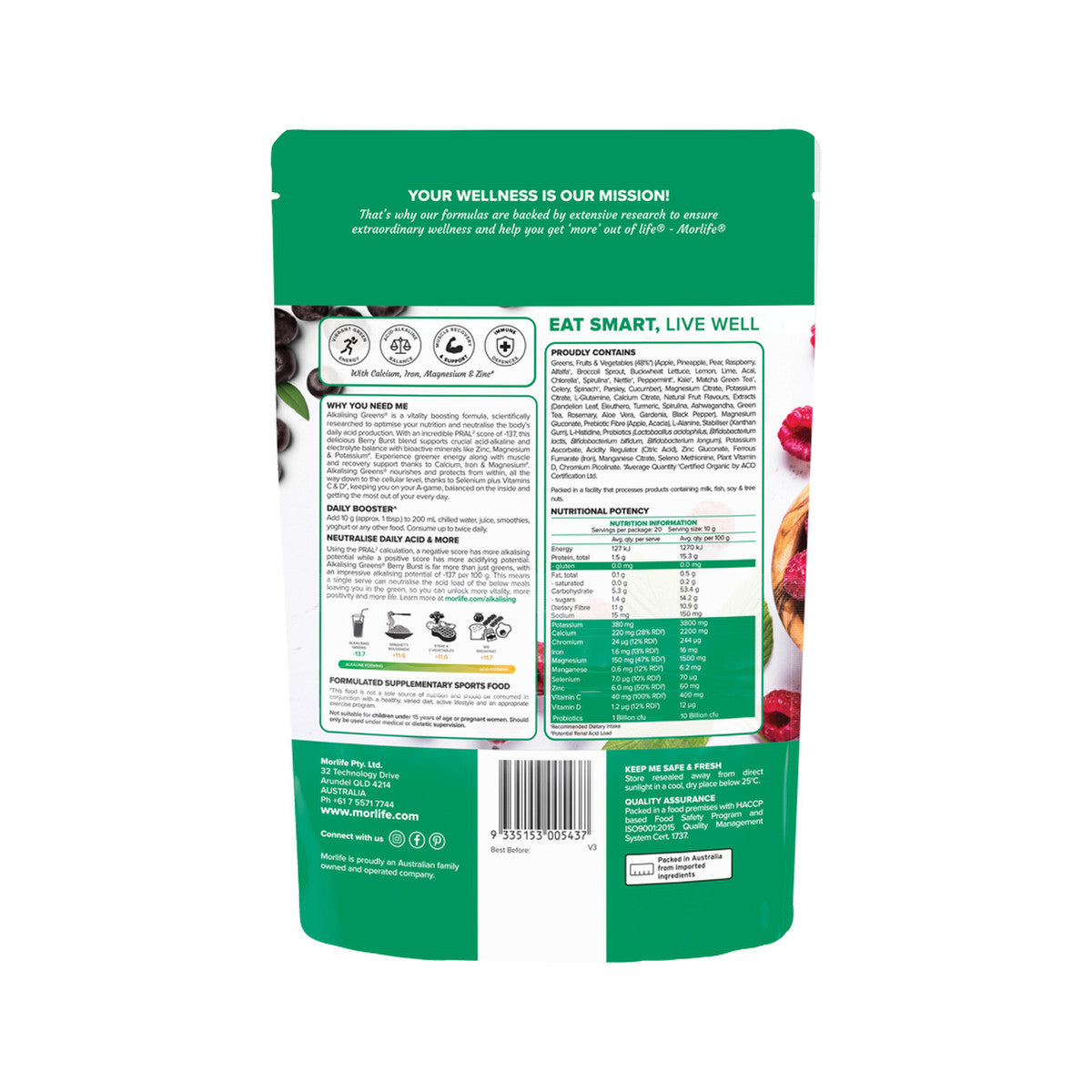 Alkalising Greens® is a vitality-boosting formula, scientifically researched to optimize your nutrition and neutralize the body’s daily acid production. Experience greener energy along with muscle and recovery support thanks to Calcium, Iron and magnesium. Alkalising Greens® nourishes and protects from within, all the way down to the cellular level, thanks to Selenium plus Vitamins C & D, keeping you on your A-game, balanced on the inside, and getting the most out of your every day.