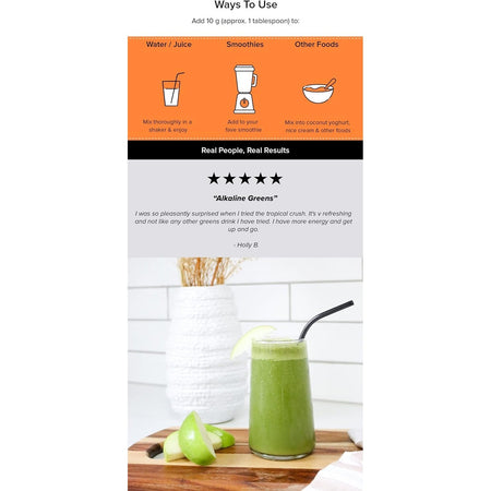 Alkalising Greens® is far more than a greens powder. This advanced multi-mineral formula is supercharged with 19+ greens, fruits & vegetables offering optimal nutrition while helping to reduce the strain from daily acid production. Alkalising Greens® offers optimal nutrition, ensuring your body has what it needs to neutralise acid, reducing the strain from daily acid production.