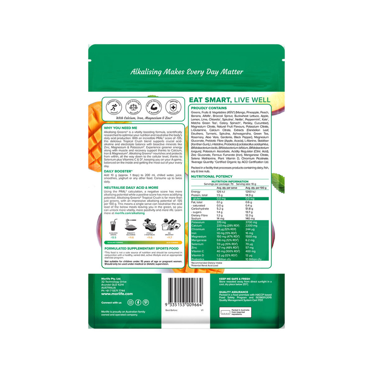 Greens, Fruits & Vegetables (45%*) (Mango, Pineapple, Peach, Banana, Alfalfa+, Broccoli Sprout, Buckwheat Lettuce, Apple, Lemon, Lime, Chlorella+, Spirulina+, Nettle+, Peppermint+, Kale+, Matcha Green Tea+, Celery, Spinach+, Parsley, Cucumber), Magnesium Citrate, Natural Fruit Flavours, Potassium Citrate, L-Glutamine, Calcium Citrate, Extracts (Dandelion Leaf, Eleuthero, Turmeric, Spirulina, Ashwagandha, Green Tea, Rosemary, Aloe Vera, Gardenia, Black Pepper), Magnesium Gluconate, Prebiotic Fibre (Apple, Acacia), L-Alanine, Stabiliser (Xanthan Gum), L-Histidine, Probiotics (Lactobacillus acidophilus, Bifidobacterium lactis, Bifidobacterium bifidum, Bifidobacterium longum), Potassium Ascorbate, Acidity Regulator (Citric Acid), Zinc Gluconate, Ferrous Fumarate (Iron), Manganese Citrate, Seleno Methionine, Plant Vitamin D, Chromium Picolinate. *Average Quantity +Certified Organic by ACO Certification Ltd.