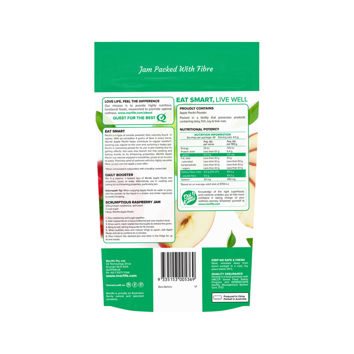 Pectin is a soluble prebiotic fibre naturally found in apples. With an incredible 4 grams of fibre in every serve, Morlife Apple Pectin helps contribute to regular laxation# while also feeding beneficial bacteria, keeping you regular to the core, and nurturing a happy gut. Pectin is commonly picked for its use in jam making due to its gelling effects, but uses also branch out into cooking and baking thanks to its thickening properties. Morlife Apple Pectin can also be enjoyed in smoothies, juices, or on its own in water. Plant the seed of wellness with this highly versatile fibre, so you can live apple-y ever after.