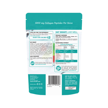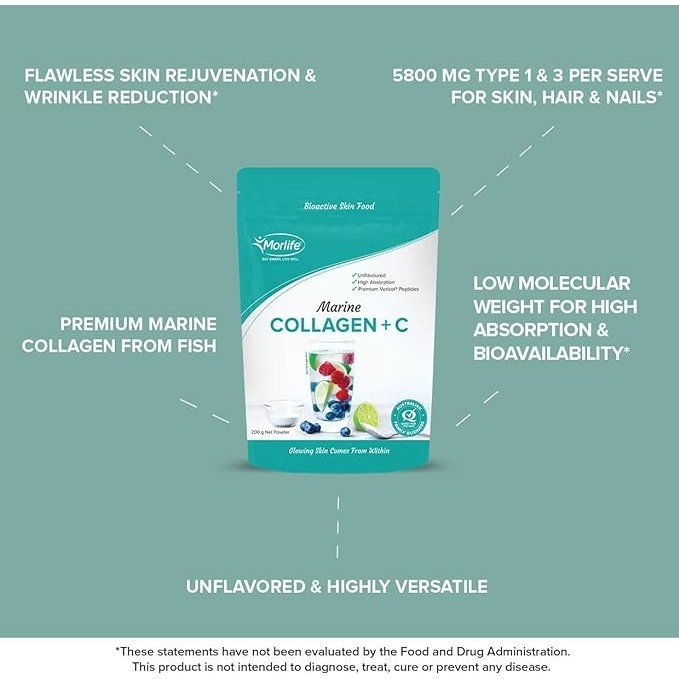 Collagen is the most abundant protein in the body, providing an essential building block for skin, bones, muscles & tendons. Morlife’s Marine Collagen + C boasts 5800mg premium Hydrolysed Collagen Peptides as well as natural vitamin C & Silica. Get creative and add our unflavoured, odourless & super versatile Marine Collagen + C to your daily routine… because glowing skin comes from within.