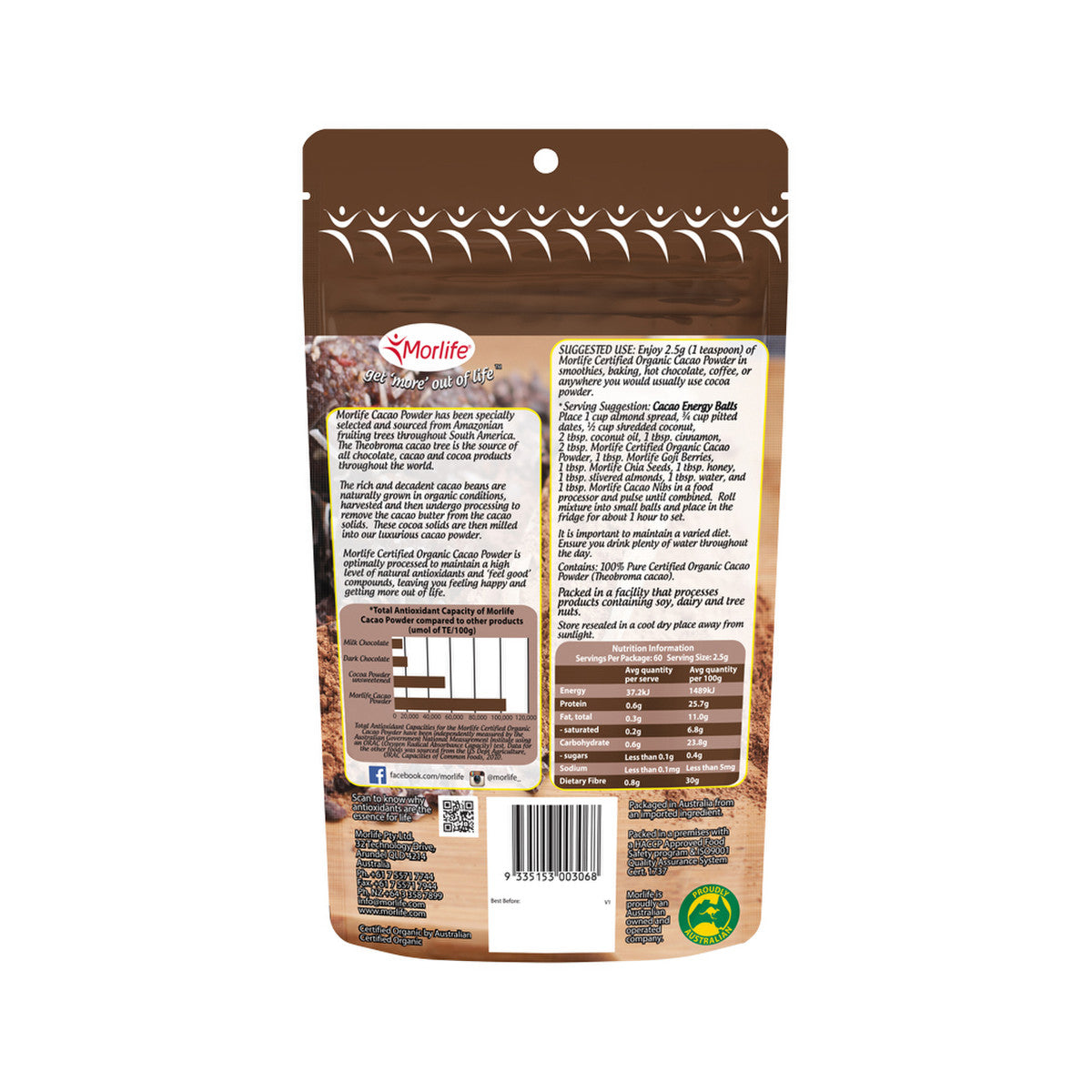 Indulge your senses with Morlife Certified Organic Cacao Powder, a decadent Amazonian superfood. From the fruiting tree and source of all chocolate and cocoa products, Morlife Certified Organic Cacao Powder is processed at a low temperature to maintain its antioxidants and other goodness.