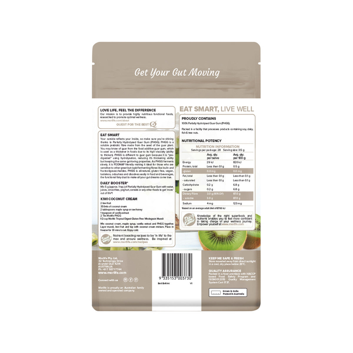 Mix 3.5 g (approx. 2 teaspoons) of Morlife Partially Hydrolysed Guar Gum with water, juices, smoothies, yoghurt, cereals or any other foods.