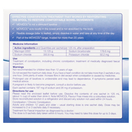 Product Claims: Unlike some laxatives that work to directly cause bowel contractions, MOVICOL works in a way that's more naturally aligned to your system. Regardless of what's caused your constipation, it's the loss of water as stools pass through your bowel that makes them hard, dry and difficult to pass. MOVICOL is formulated to help rectify this by aiding water retention in the bowel for an easier, more natural bowel movement. MOVICOL usually takes between 24 and 48 hours to act. While some laxatives may work slightly faster, the onset of their action can be relatively harsh and sometimes unpredictable. MOVICOL gives you effective but gentle control compared with most other laxatives. Always read the label. Use only as directed and consult your Healthcare Professional if symptoms persist..