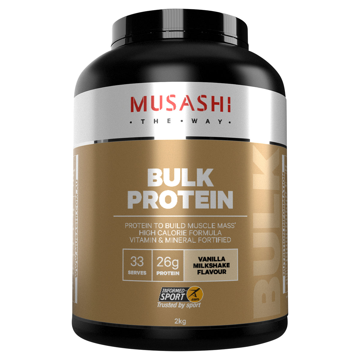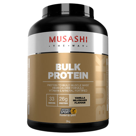MUSASHI Bulk Protein is a scientifically formulated nutritional supplement for body builders and athletes looking to maximise muscle growth and replenish glycogen stores. This high performance formula consists of premium grade multi-source protein and readily absorbed carbohydrate blend. Fortified with vitamins, minerals, and is boosted with naturally occurring essential amino acids (EAAs) and branched chain amino acids (BCAAs). This high calorie formula comes in an easy to drink great tasting protein shake.