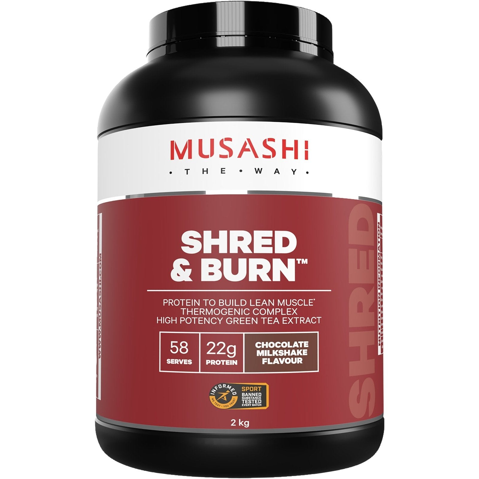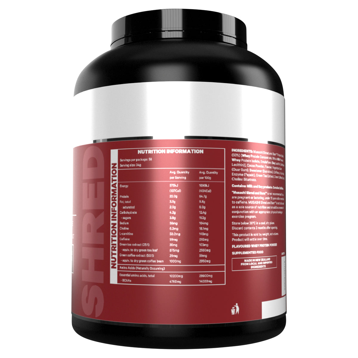 Musashi Shred and Burnâ„¢ Protein Blend (93%) [Whey Protein Concentrate, Whole Milk Powder, Whey Protein Isolate, Emulsifiers (Soy Lecithin, Sunflower Lecithin)], Cocoa Powder, Flavour, Vegetable Gum (Guar Gum), Sweetener (Sucralose), Caffeine, L-Carnitine, Enzyme (Papain), Green Tea Extract, Green Coffee Extract, Choline Bitartrate.