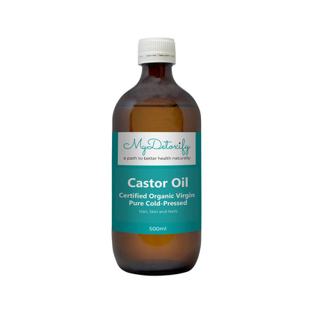 Discover the natural benefits of MyDetoxify Certified Organic Virgin Pure Cold-Pressed Castor Oil. This 500ml bottle is rich in fatty acids and essential nutrients, perfect for promoting healthy skin and hair growth. Trust in its pure, organic formula for an effective detoxifying experience.