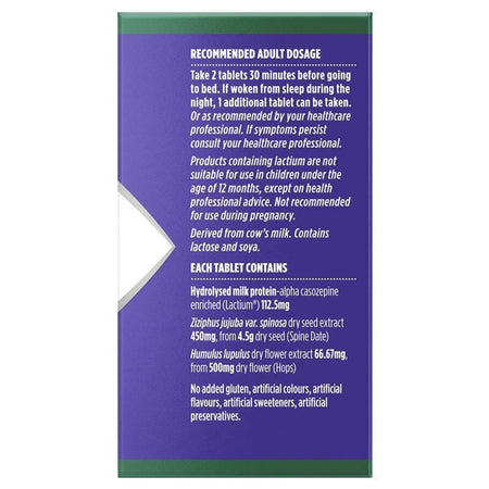 Contains Ziziphus, Hops & 50% more Lactium®#. Traditionally* used to calm the nerves, reduce the time to fall asleep, and relieve restless sleep*. Relieves symptoms of stress.