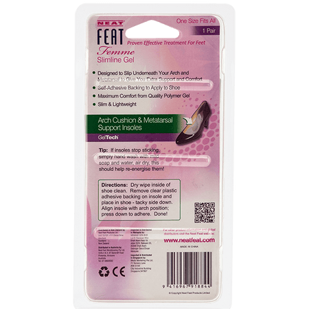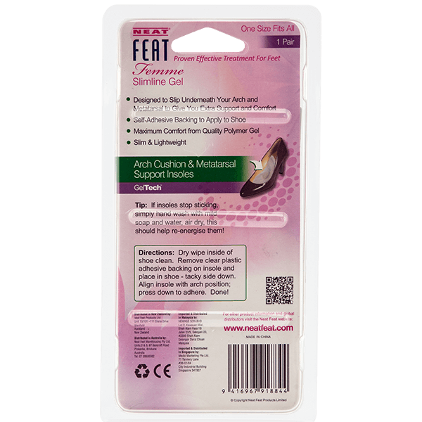 Femme Slimline Gel Arch Cushion & Metatarsal Insoles are designed to slip underneath your arch and metatarsal to give you extra support and comfort. The insoles have a self-adhesive backing to apply to the shoe. Slim, light weight and made with a quality polymer gel, Femme Slimline Gel Arch Cushion & Metatarsal Insoles provides maximum comfort.