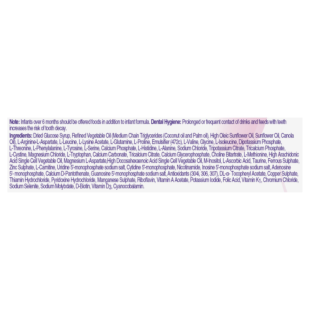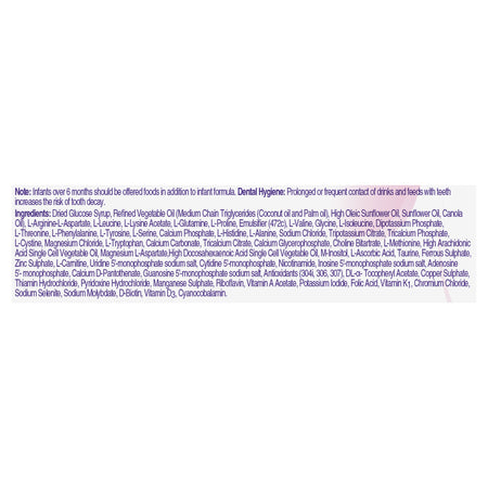 Dried Glucose Syrup, Refined Vegetable Oil (Medium Chain Triglycerides (Palm Kernel and/or Coconut Oil), High Oleic Sunflower Oil, Sunflower Oil, Canola Oil), L-Arginine L-Aspartate, LLeucine, L-Lysine Acetate, L-Glutamine, LProline, Emulsifier (E472c), L-Valine, Glycine, L-Isoleucine, Dipotassium Phosphate, LThreonine, L-Phenylalanine, LTyrosine, L-Serine, Calcium Phosphate Dibasic, L-Histidine, L-Alanine, Sodium Chloride, Tripotassium Citrate, Tricalcium Phosphate, L-Cystine, Magnesium Chloride, L-Tryptophan, Calcium Carbonate, Tricalcium Citrate, Calcium Glycerophosphate, Choline Bitartrate, L-Methionine, High Arachidonic Acid Single Cell Vegetable Oil, Magnesium LAspartate, High Docosahexaenoic Acid Single Cell Vegetable Oil, M-Inositol, L-Ascorbic Acid, Taurine, Ferrous Sulphate, Zinc Sulphate, LCarnitine, Uridine 5'-monophosphate Disodium Salt, Cytidine 5'- monophosphate, Nicotinamide, Inosine 5'-monophosphate Disodium Salt, Adenosine 5'-monophosphate, Calcium DPantothenate, Guanosine 5'-monophosphate Disodium Salt, Antioxidants (E304i, E306, E307), DL-alpha Tocopheryl Acetate,