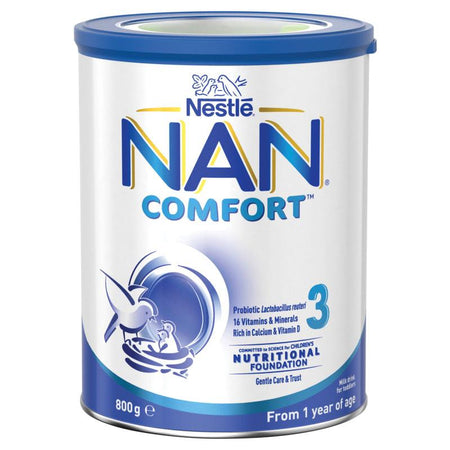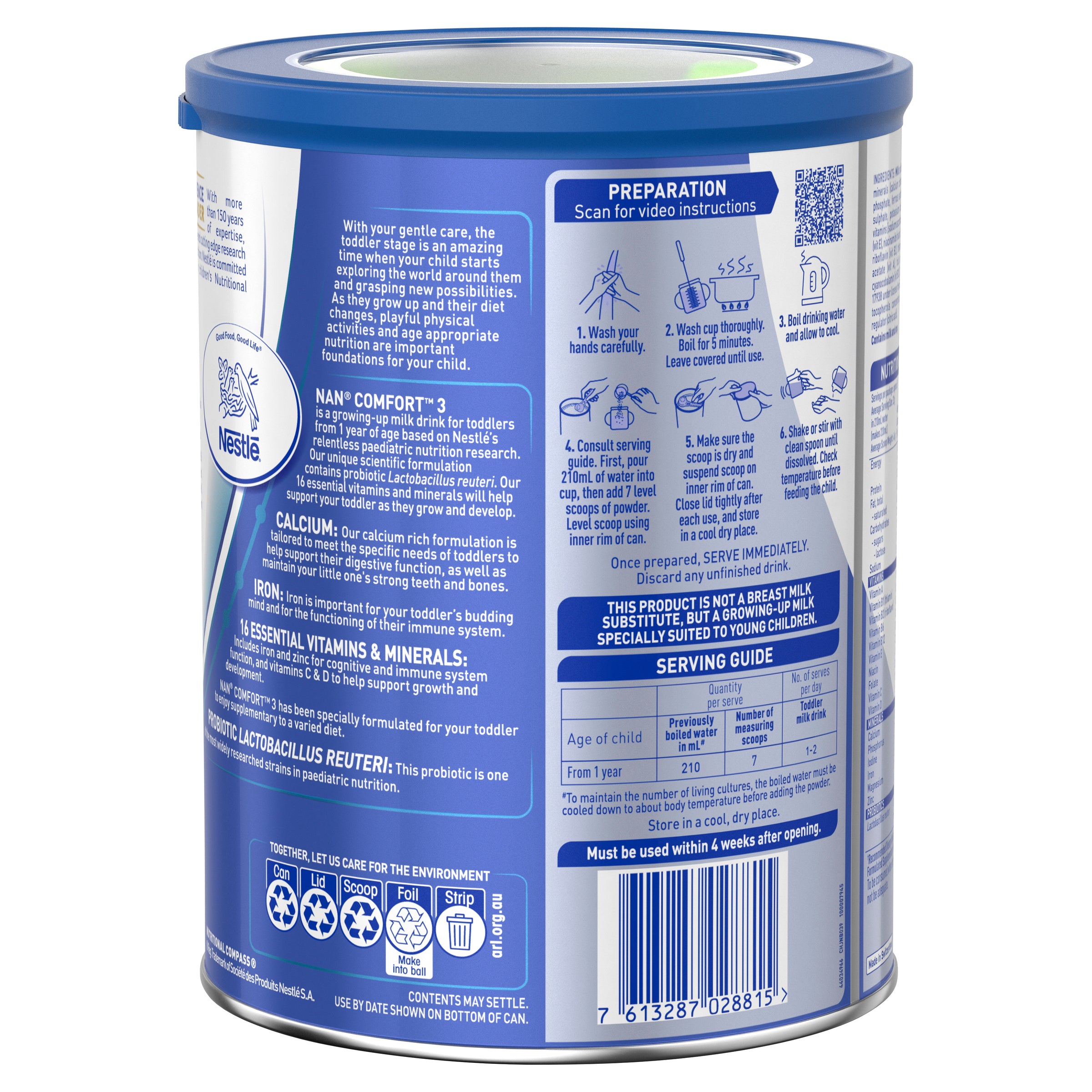 • NAN COMFORT 3 is a growing up milk drink for toddlers from 1 year. Our unique scientific formulation contains probiotic Lactobacillus reuteri & 16 essential vitamins and mineral which help support your toddler, as they grow and develop.