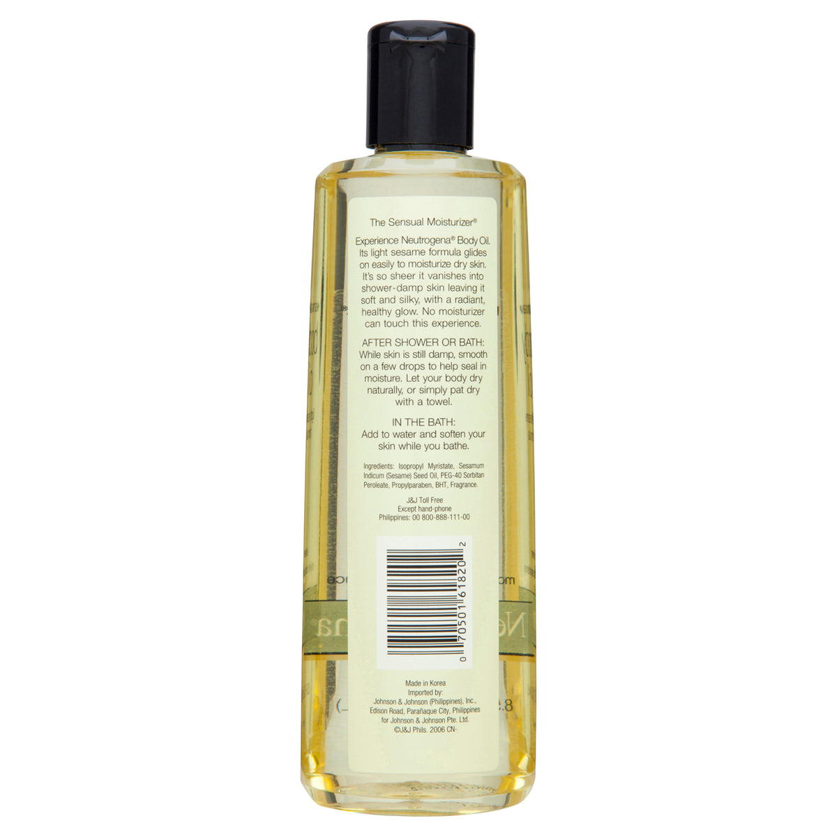 Experience Neutrogena Body Oil. Its light sesame formula glides on easily to moisturise dry skin. It's so sheer it vanishes into shower-damp skin leaving it soft and silky, with a radiant, healthy glow. No moisturizer can touch this experience.