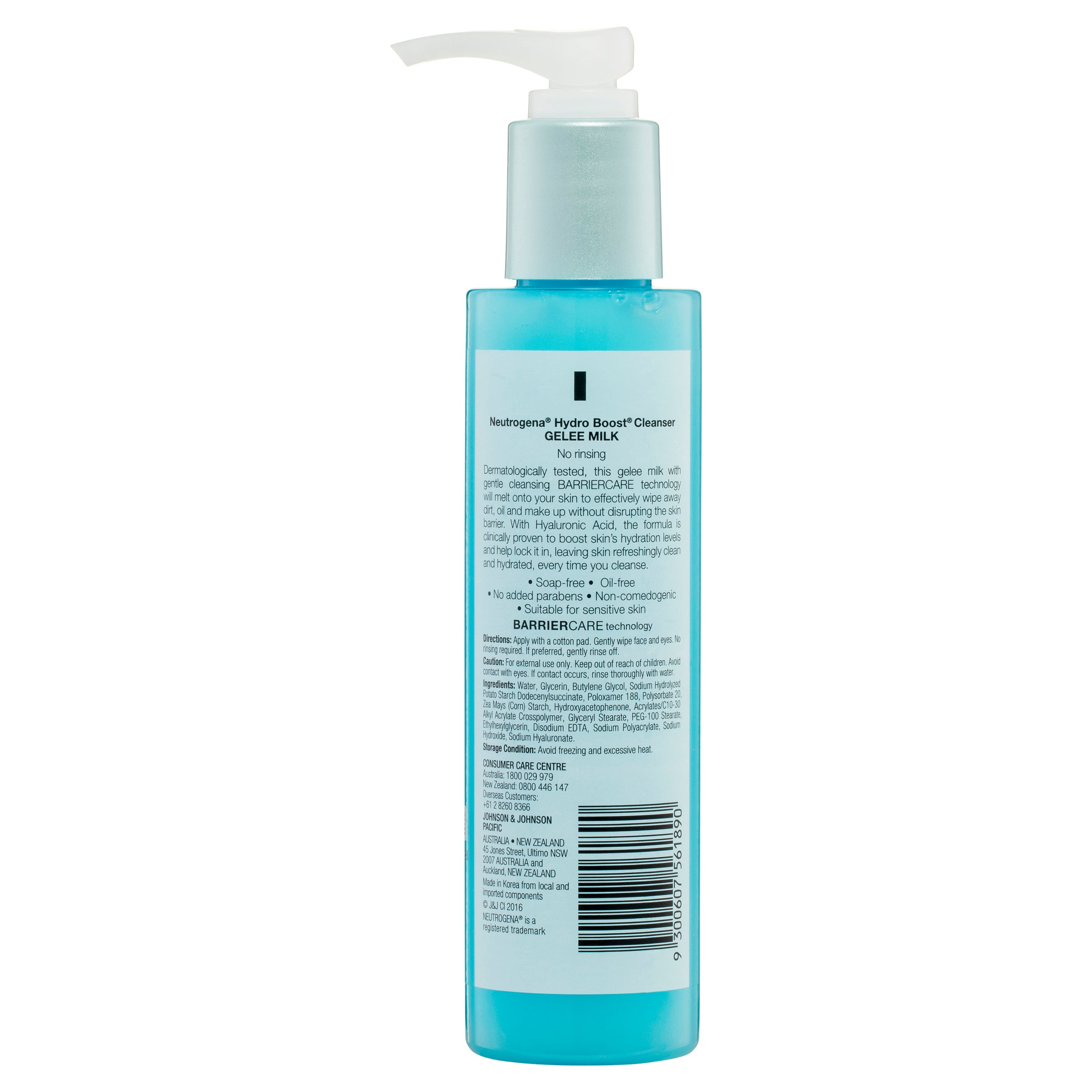 Neutrogena Hydro Boost Gelee Milk Cleanser effectively cleanses, removes waterproof makeup and boosts skin's hydration with no rinsing.