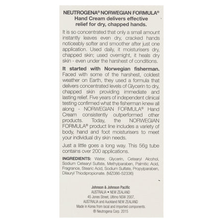 Neutrogena Norwegian Formula Hand Cream delivers effective relief for dry, chapped hands. It is so concentrated that only a small amount instantly leaves even dry, cracked hands noticeably softer and smoother after just one application. Used daily, it moisturises dry, chapped skin used overnight, it heals dry skin - even under the harshest of conditions.It started with Norwegian fisherman. Faced with some of the harshest, coldest weather on earth, they used a formula that delivers concentrated levels of glycerin to dry, chapped skin providing immediate and lasting relief. Five years of independent clinical testing confirmed what the fisherman had known all along Norwegian FormulaHand Cream consistently outperformed other products. Today, the Norwegian Formula product includes a variety of body, hand and foot moisturises to meet your individual dry skin needs.Just a little goes a long way. This 56g tube contains over 200 applications.Suitable For: Daily use