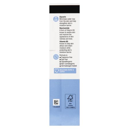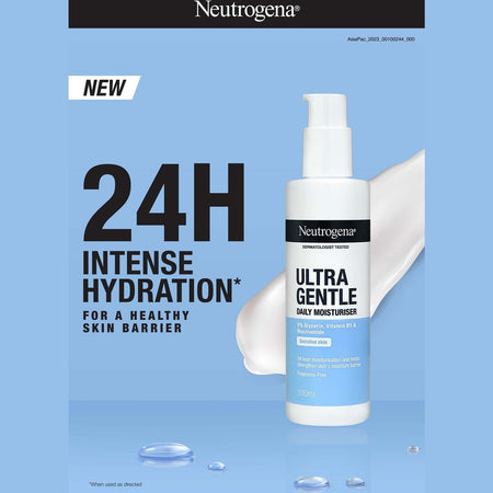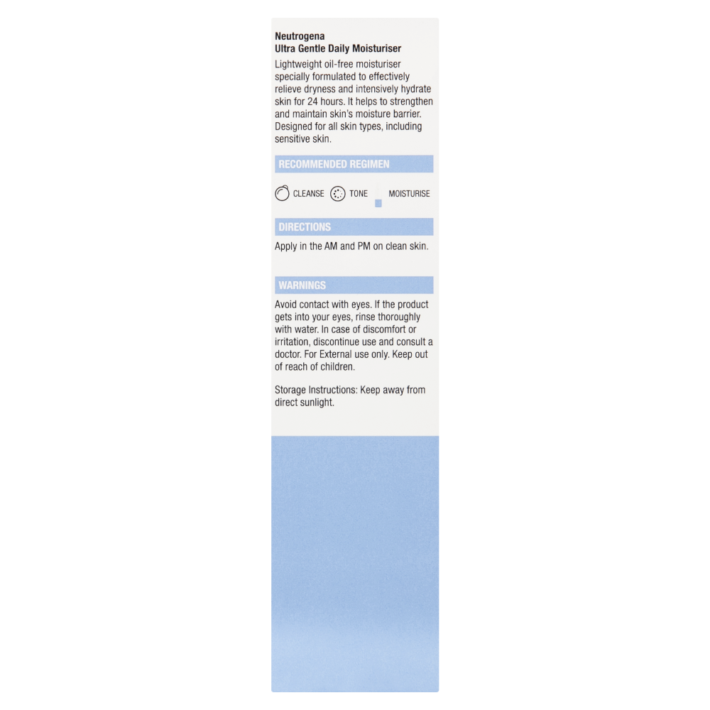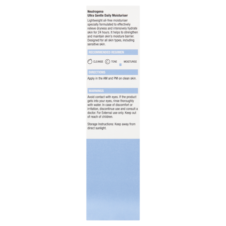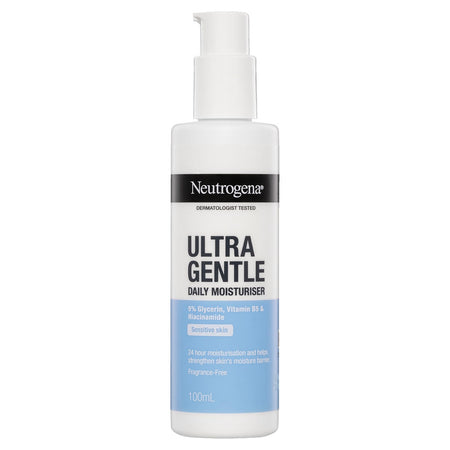 Neutrogena Ultra Gentle Daily Moisturiser Sensitive is a lightweight, oil-free moisturiser specifically formulated to effectively relieve dryness and hydrate skin for 24 hours.? Made with Glycerine, well known to improve skin hydration, and helps strengthen skin's moisture barrier, Vitamin B5 known to help skin attract and retain moisture, and Niacinamide known to soothe skin and improve the appearance of skin redness and tone.?After 1st use: