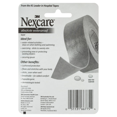 Nexcare Absolute Waterproof Tape flexes and stretches with your body, cushions as it protects and sticks to damp skin. These features make Nexcare Absolute Waterproof First Aid Tape ideal for active lifestyles and exercising, and for protecting wounds during water related activities like bathing and swimming.