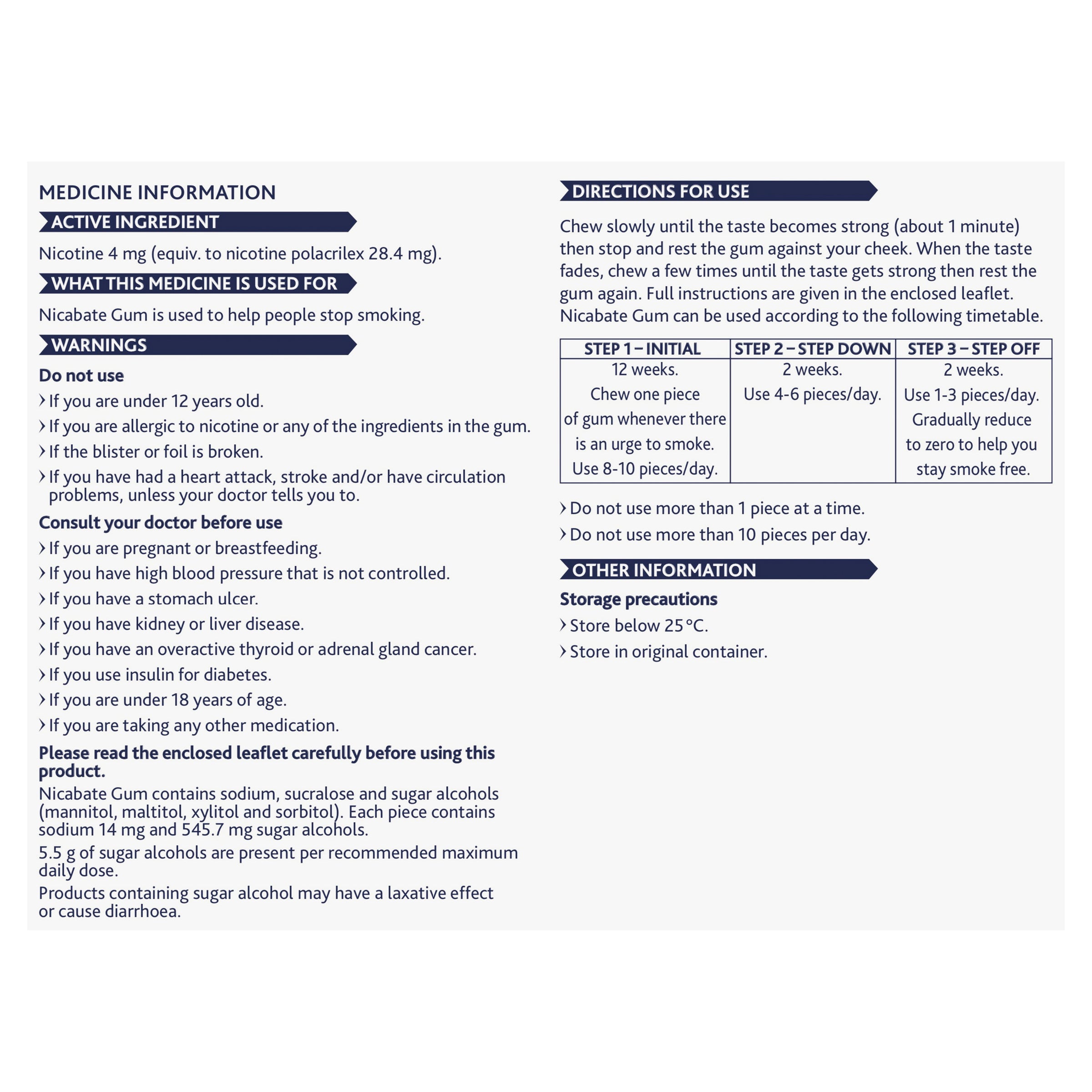 Chew slowly until the taste becomes strong (about 1 minute) then stop and rest the gum against your cheek. When the taste fades, chew a few times until the taste gets strong, then rest the gum again. Full instructions are given in the enclosed leaflet. Nicabate Gum can be used according to the following timetable.