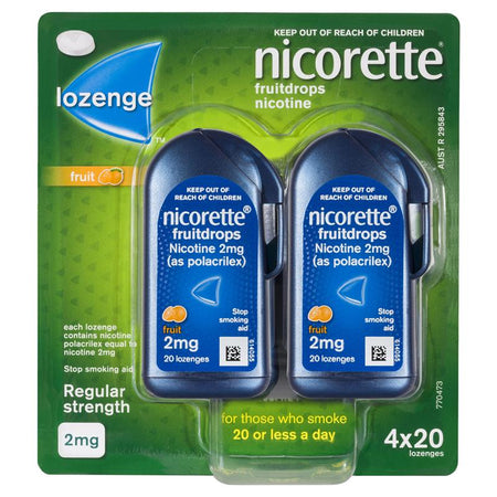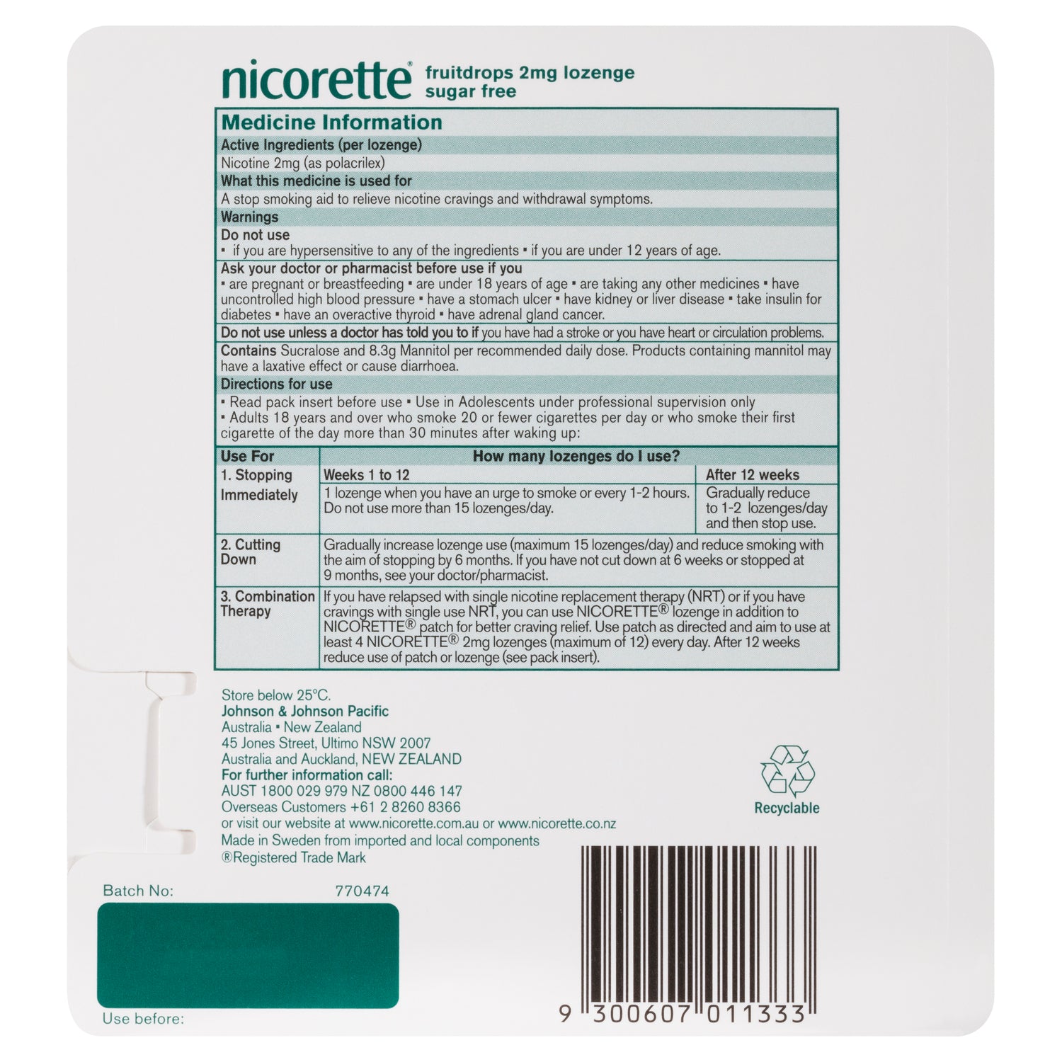 Nicorette Fruit drops Nicotine Lozenges Regular strength 2mg with a fruit flavour is a quit smoking aid.- Sugar free nicotine lozenges