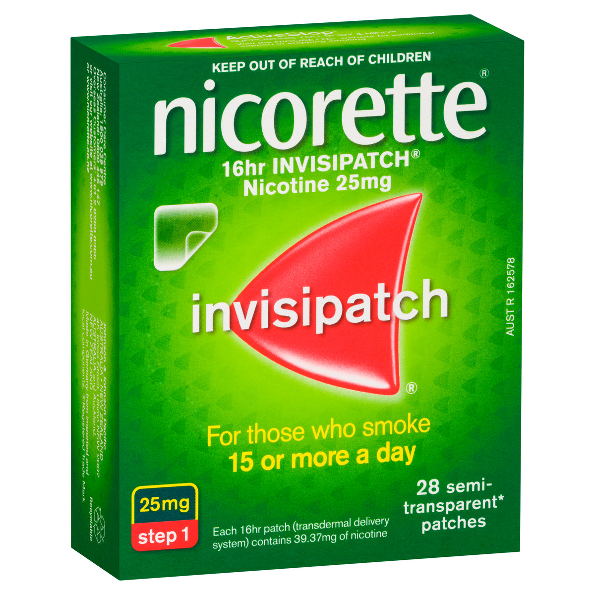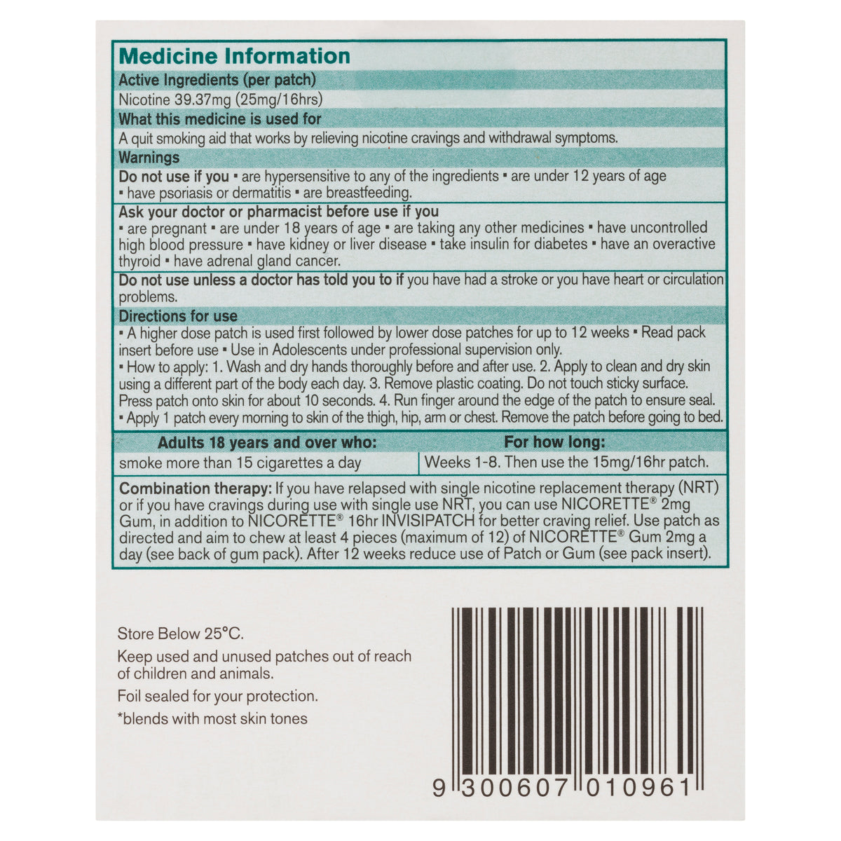 Nicorette 16hr Invisipatch Patches Step 1 25mg is a quit smoking aid for those who smoke 15 or more a day.