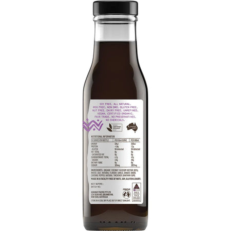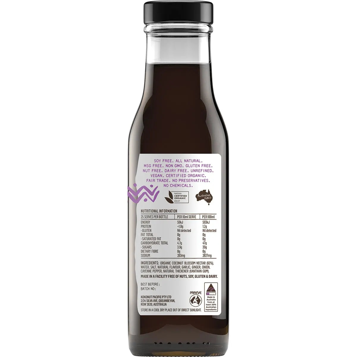 Organic Coconut Blossom Nectar (60%), Water, Salt, Natural Flavour, Garlic, Ginger, Onion, Cayenne Pepper, Natural Thickener (Xanthan Gum).