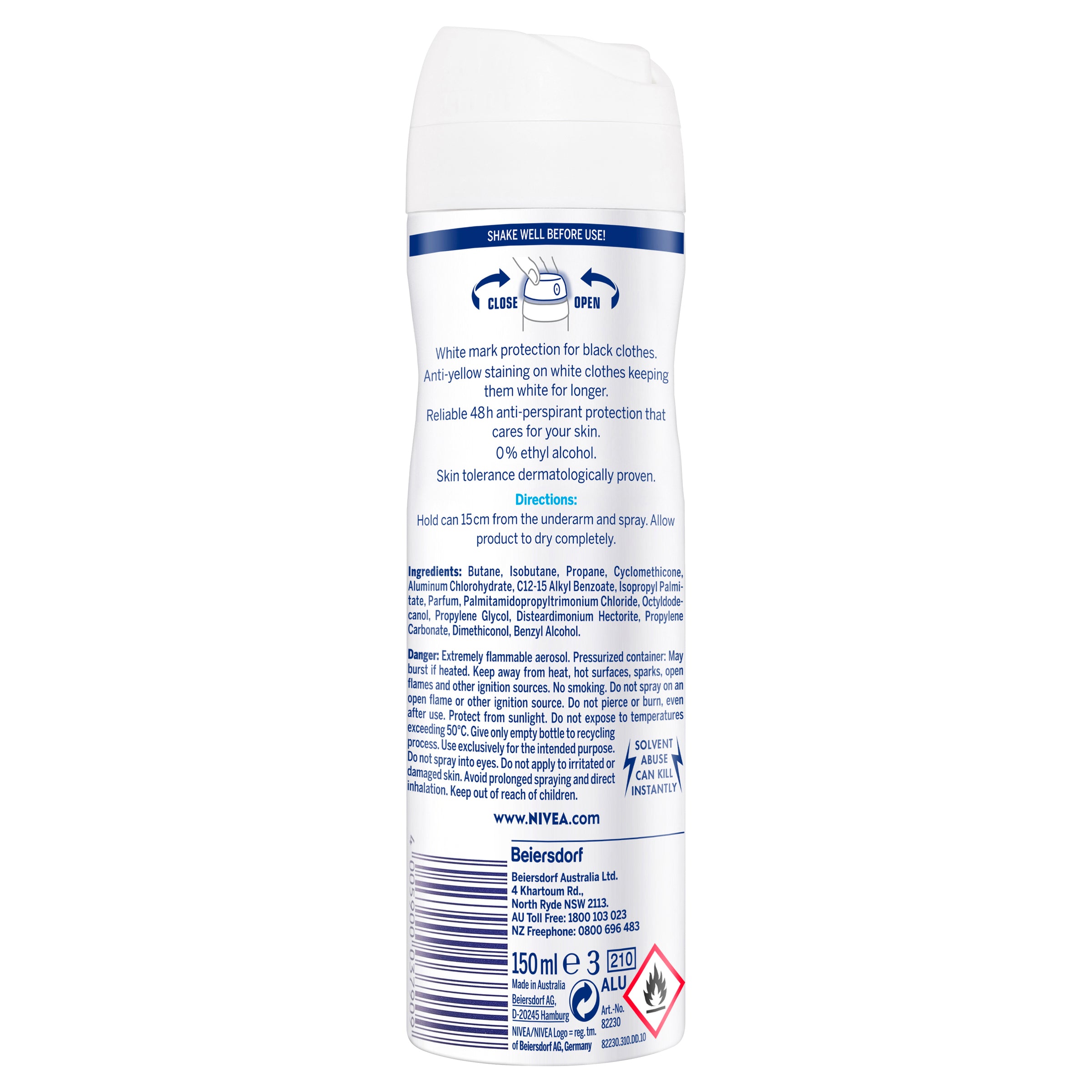 • White mark protection on black clothing & anti-yellow staining on white clothing.• 48h anti-perspirant protection and gentle NIVEA® care.