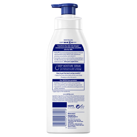 48h nourishing deep moisture care and noticeably smoother skin: NIVEA Cocoa & Indulging body lotion.