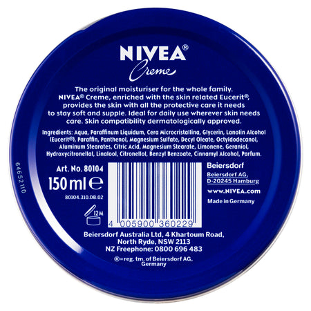 NIVEA Creme is the original moisturiser for the whole family. This iconic product is enriched with the skin related Eucerit®, which provides the skin with all the Protective care it needs to stay soft and supple. Ideal for daily use wherever skin needs care. Skin compatibility dermatologically approved: NIVEA Creme.Size: 150mL