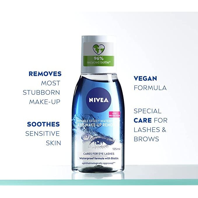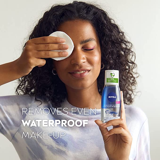 NIVEA Double Effect Eye Make-up Remover removes extreme waterproof eye make-up and mascara. The sensitive eye area is efficiently yet gently cleansed to protect the eyelashes. The caring bi-phase formula with Cornflower Extract means that no rubbing is needed. The product does not leave any unpleasant greasy residue.Skin compatibility dermatologically and ophthalmologically approved.