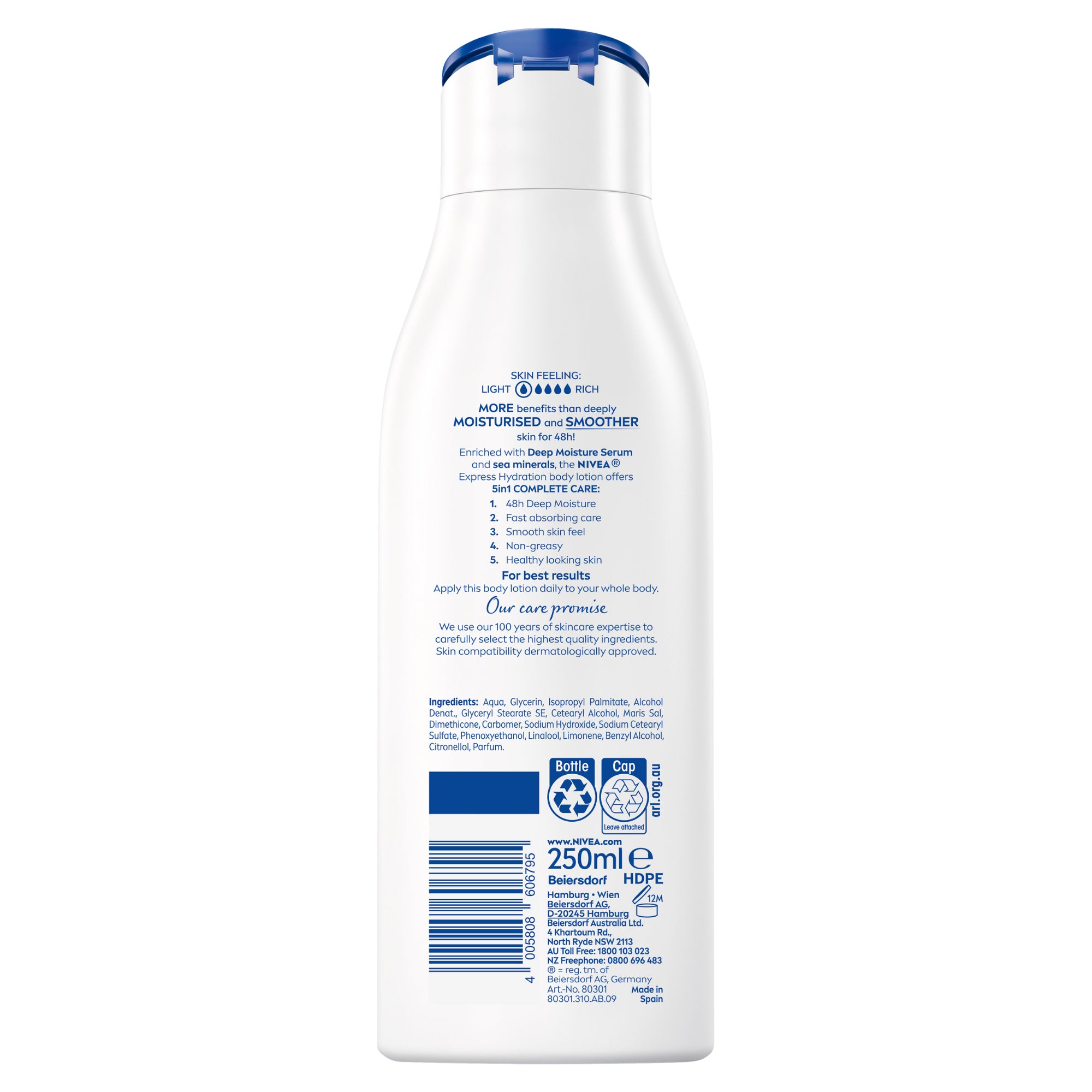 48h fast absorbing deep moisture care and noticeably smoother skin: NIVEA Express Hydration body lotion.