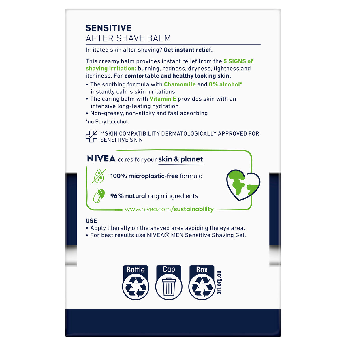 NIVEA MEN Sensitive Aftershave Balm instantly relieves from 5 signs of skin irritation: burning, redness, dryness, tightness and itchiness.The formula enriched with Chamomile and Vitamin E provides skin with an intense long-lasting hydration. It is fast absorbing, non-greasy and non-sticky. Alcohol free formula is dermatologically approved on men with sensitive skin.