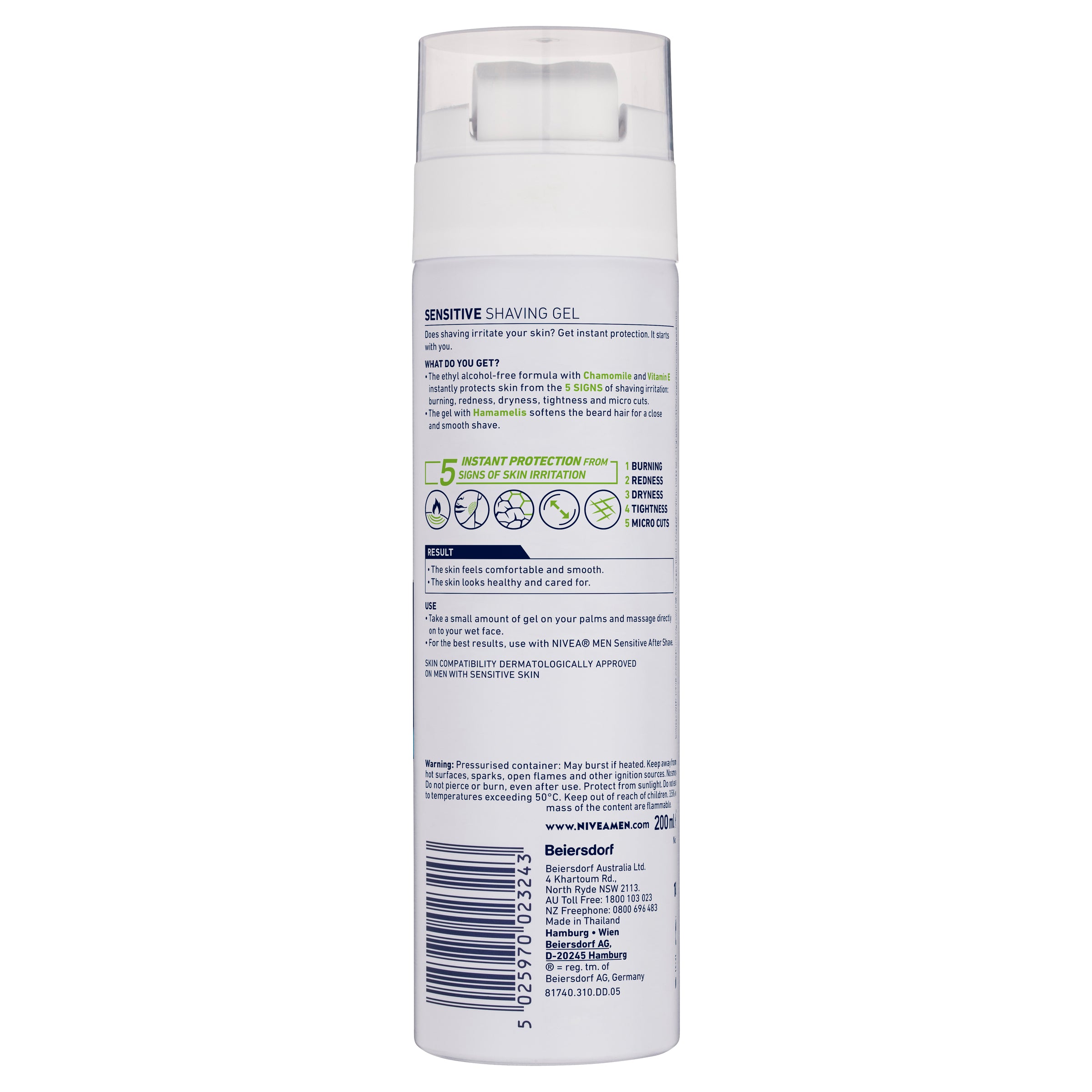 NIVEA MEN Sensitive Shaving Gel instantly protects skin from 5 signs of shaving irritation: burning, redness, dryness, tightness and micro cuts.The gel with Chamomile and Vitamin E softens beard hair for a close and ultimate smooth shave. Alcohol free formula is dermatologically approved on men with sensitive skin.
