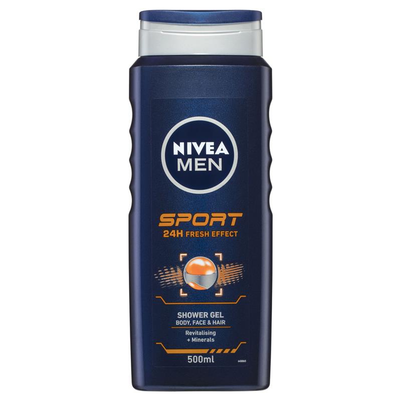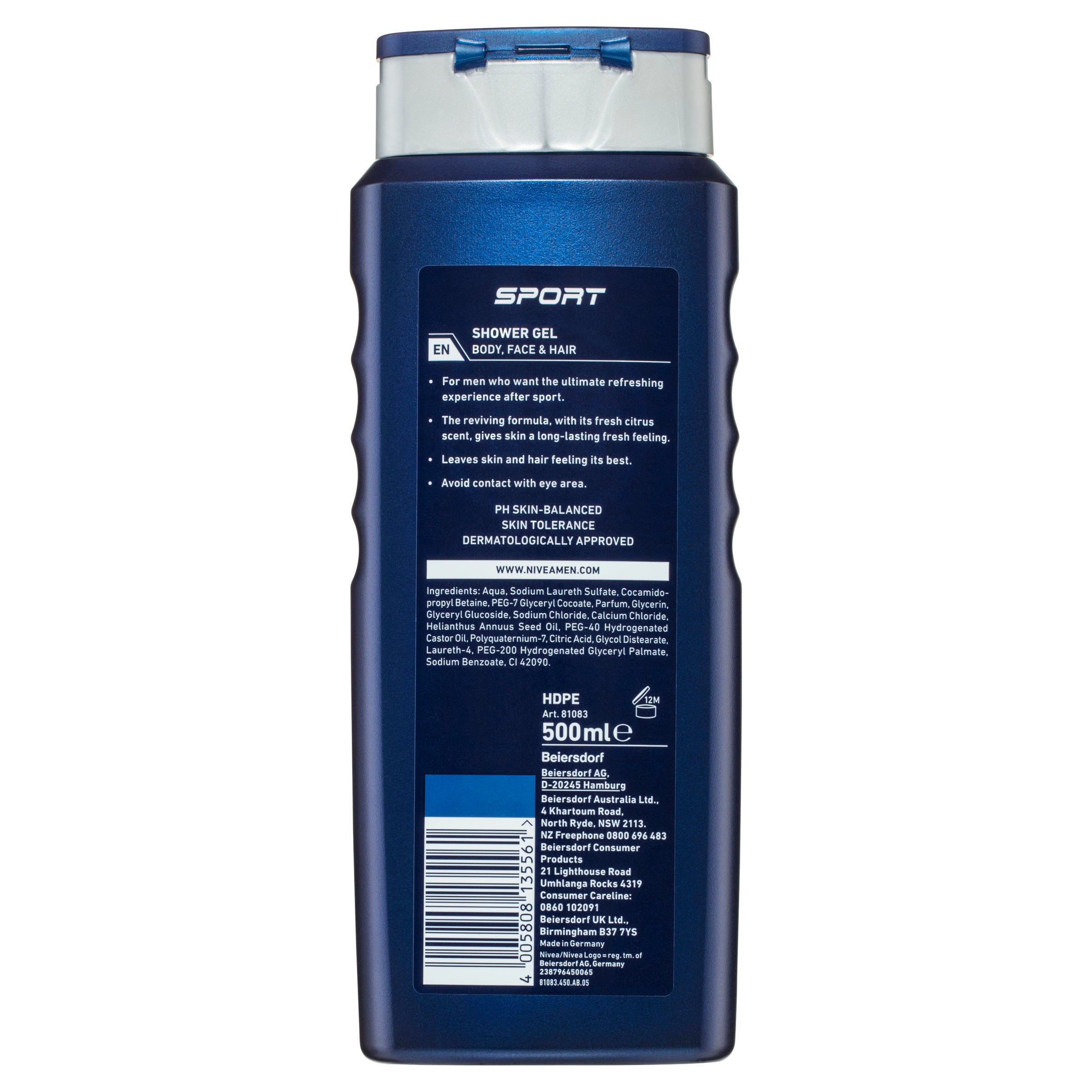 NIVEA MEN 3-in-1 Sport Shower Gel for Body, Face & Hair invigorates and cleans your skin and hair leaving it feeling revitalised and cared for. The caring formula with its fresh masculine lime scent provides your skin with long-lasting freshness.Size: 500mL