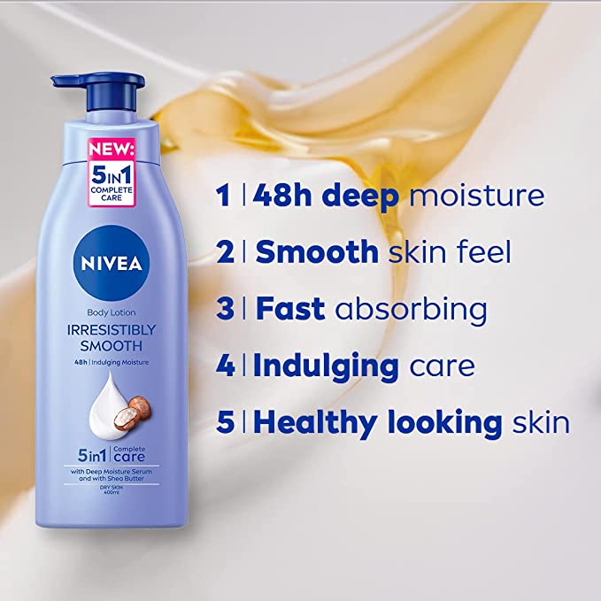 The NIVEA Irresistibly Smooth Body Lotion is infused with the NIVEA DEEP MOISTURE SERUM and precious Shea Butter.The patented NIVEA formula uses the knowledge that our skin contains sufficient moisture in its deeper layers.