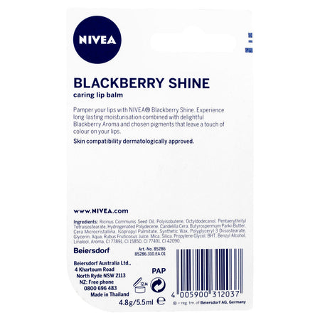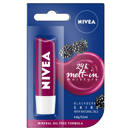 NIVEA Blackberry Shine with natural oils provides 24h melt-in moisture for smooth and shiny lips.