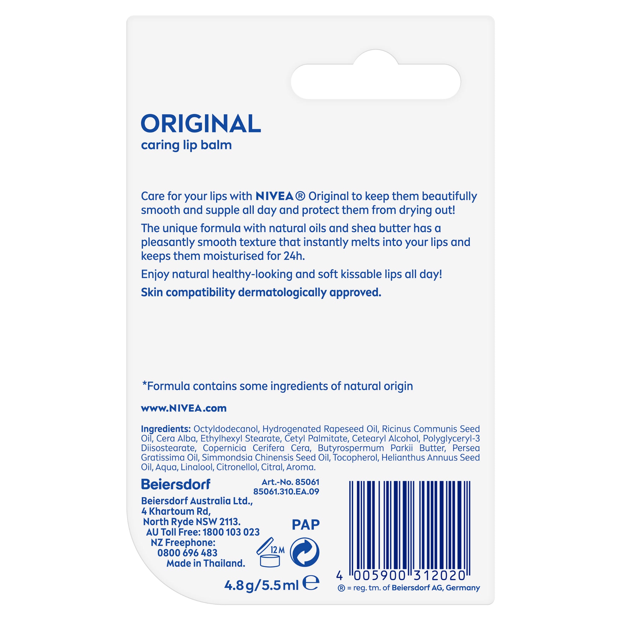 Care for your lips with NIVEA Original Care to keep them beautifully smooth all day and protect them from drying out!The unique formula with natural oils and Shea Butter has a pleasantly smooth texture that instantly melts into your lips and keeps them moisturised for 24h.