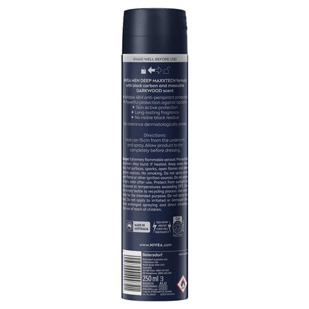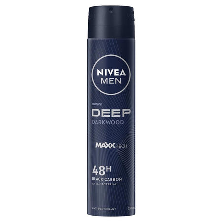 NIVEA MEN DEEP Anti-perspirant protects the skin from sweat and bacteria for a long-lasting dryness and a clean skin feel just like after the shower.The effective formula with Black Carbon acts powerfully against bacteria and is complemented by a modern and masculine Dark Wood fragrance.