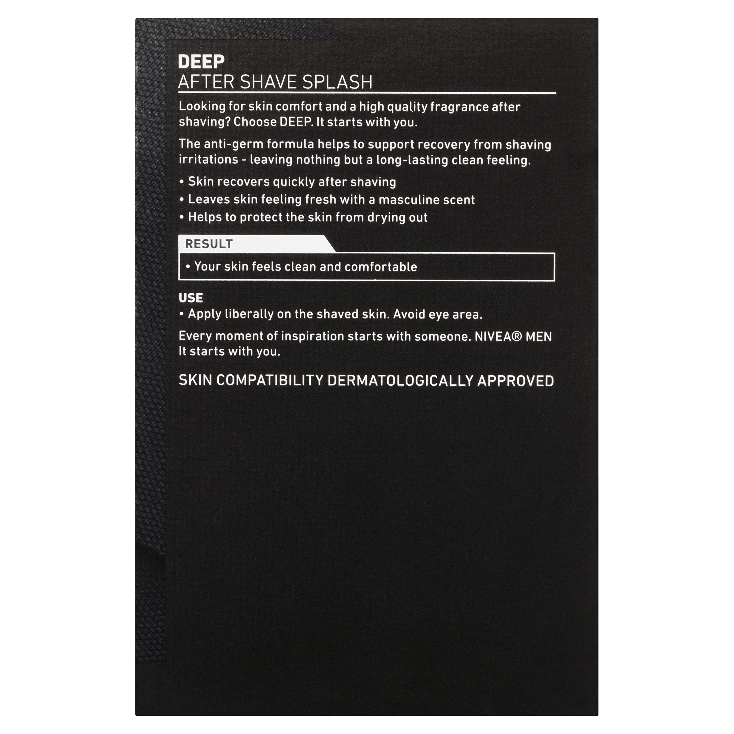 NIVEA MEN DEEP After Shave formula with an anti-bacterial effect supports the recovery from shaving irritations, leaving nothing but a clean skin feeling.