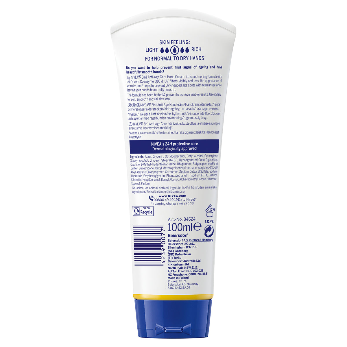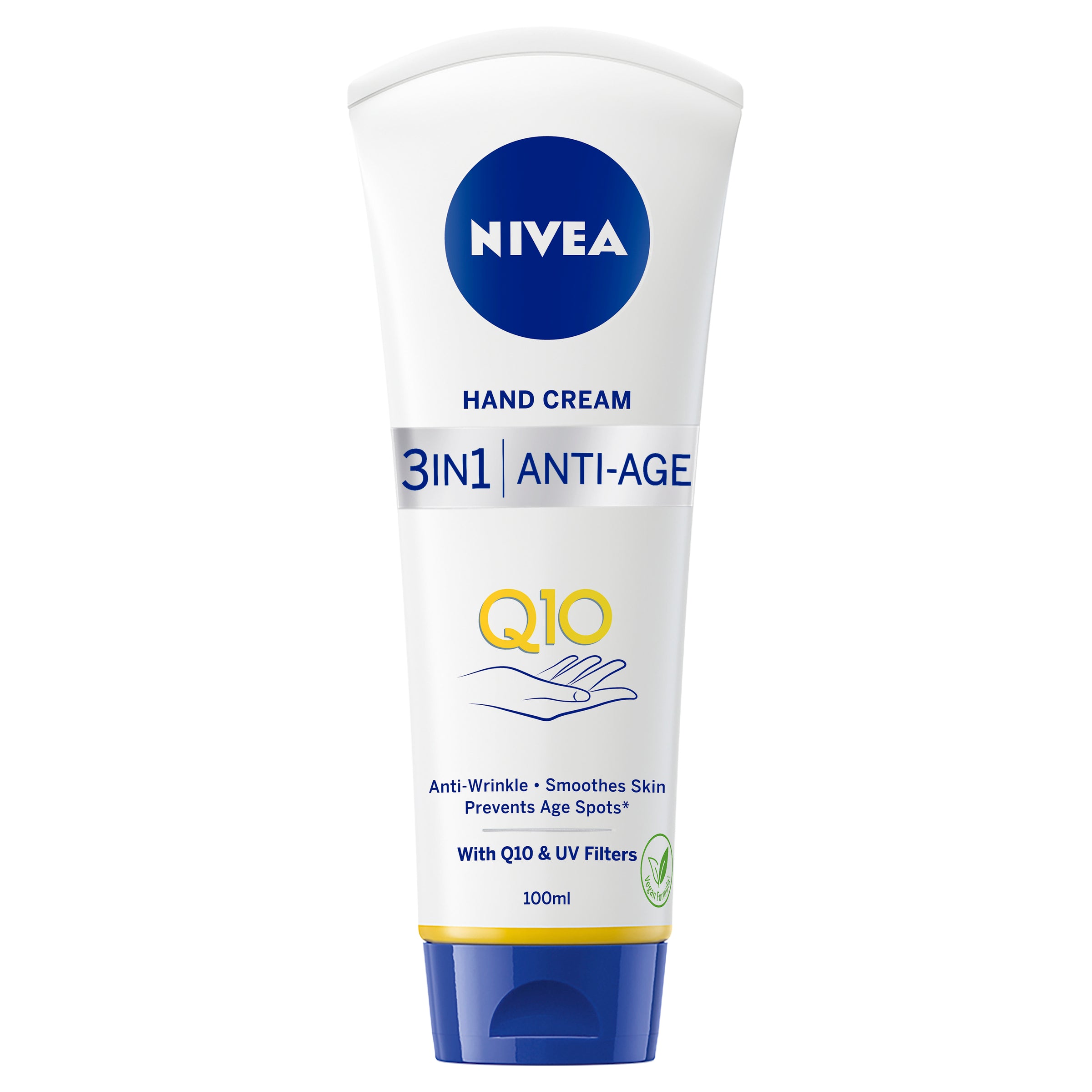 Try NIVEA Anti-Age 3 in 1 Care Hand Cream with Q10 complex and UVA/UVB filters for beautiful, smooth hands. Perfectly cares for dry skin without feeling greasy whilst combating the visible signs of aging - Anti-Wrinkle, Smoothes Skin, Prevents Age Spots.Soap-Free?: No