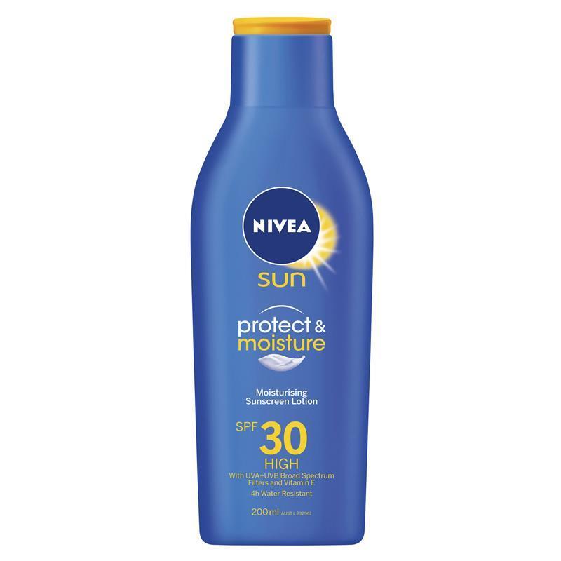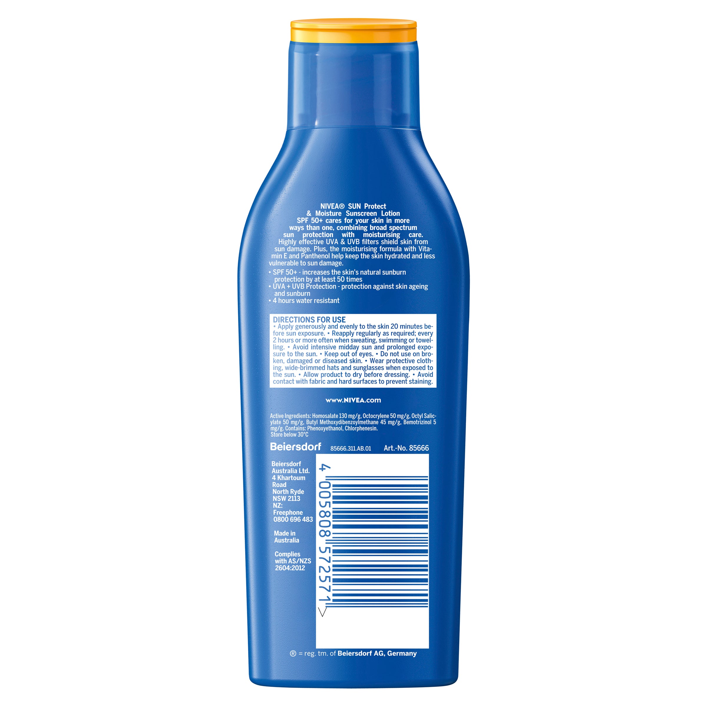 NIVEA SUN Protect & Moisture Moisturising Sunscreen Lotion SPF50+ cares for you and your skin in more ways than one. With broad spectrum sun protection and a moisturising formula, this sunscreen both protects you from harmful ultraviolet (UV) rays and moisturises your skin.Highly effective UVA & UVB filters shield skin from sun damage, plus the moisturising formula with Vitamin E and Panthenol help keep the skin hydrated and less vulnerable to sun damage.