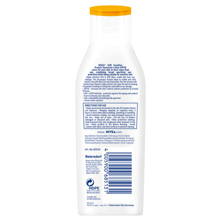 NIVEA SUN Sensitive Protect Sunscreen Lotion SPF50 cares for your skin in more ways thanone, combining broad spectrum sun protection whilst being suitable for sensitive skin.
