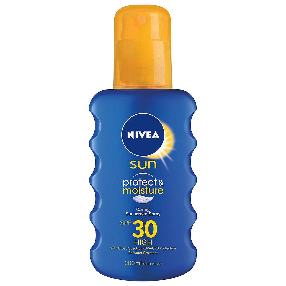 Nivea Sun Caring Sunscreen Spray SPF 30 with broad spectrum UVA- UVB protection and is water resistant for 2 hours. Light, fast absorbing formula Provides maximum SPF30+ protection with maximum care Broad spectrum UVA & UVB filters protect skin from sunburn & premature skin ageing & provides 2 hours water resistant protection |