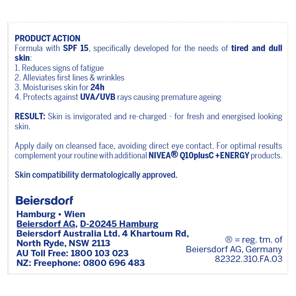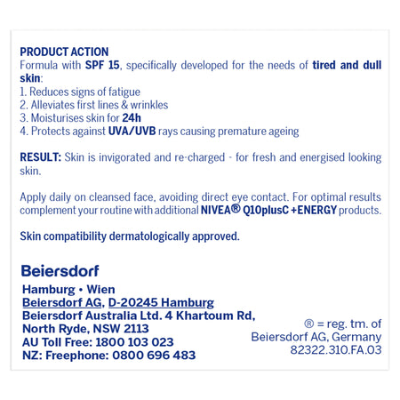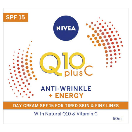 NIVEA Q10 plus C Anti-Wrinkle + Energy Day Cream combines two renowned and powerful anti-oxidants: Q10 and Vitamin C. Q10 is a powerful active ingredient naturally found in the skin. But with age its level decreases leaving the skin with less energy. The highly effective formula replenishes the skin with Q10. Vitamin C is known to protect the skin against free radicals - an important effect to delay signs of ageing. NIVEA Q10 plus C Anti-Wrinkle + Energy Day Cream recharges dull and tired skin. The formula immediately invigorates the skin and moisturises intensely for greater freshness and visibly smoother skin. SPF 15 and UVA/UVB protection help to protect the skin against sun-induced wrinkle formation and premature skin ageing.Suitable For: Suitable for sensitive skin.
