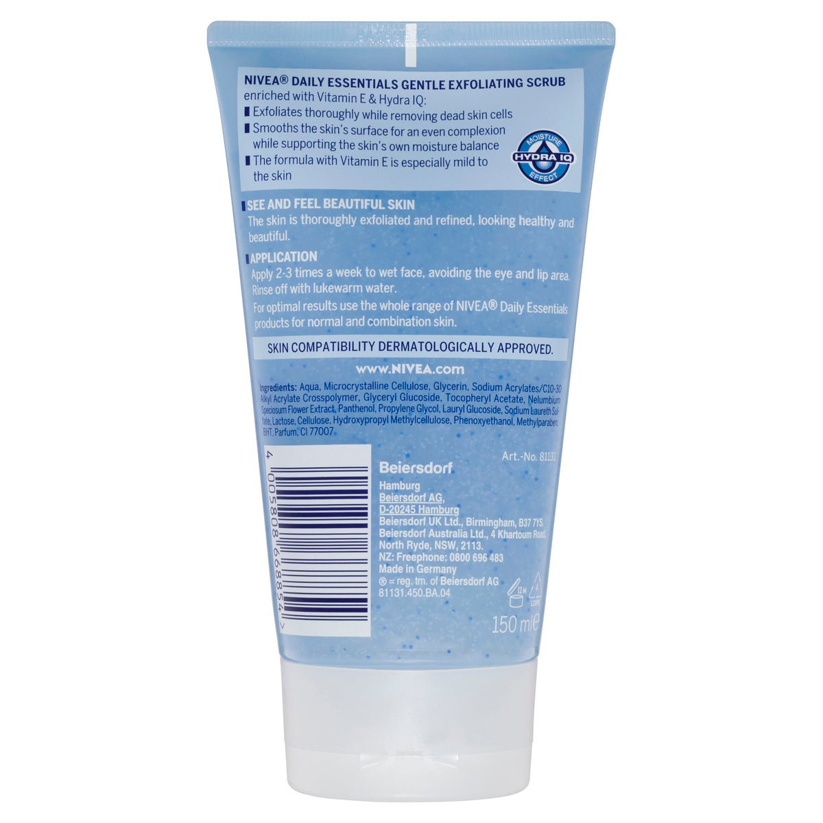 It's so important to respect your skin's natural moisture balance - especially during cleansing. This is why NIVEA has introduced revolutionary Hydra IQ moisture technology. NIVEA Daily Essentials Gentle Exfoliating Scrub will exfoliate thoroughly yet gently for a smooth and even complexion.Formulated with Hydra IQ technology to enhance your skin's natural moisturisation, while Vitamin E is especially mild to the skin.