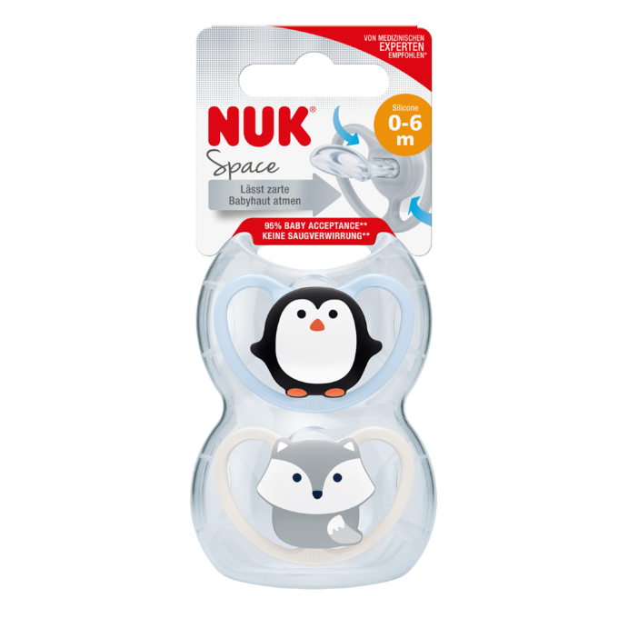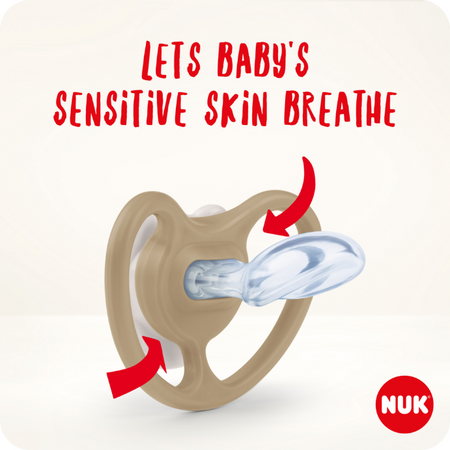 NUK Space Soothers are specially designed for baby's sensitive skin. They offer maximum air circulation thanks to extra-large ventilation holes that prevent saliva irritation. The orthodontic NUK Shape is modelled on a mother's nipple as she breastfeeds and is 95%* accepted by babiesProduct Claims: 99% of mums recommend for babies with sensitive skin*