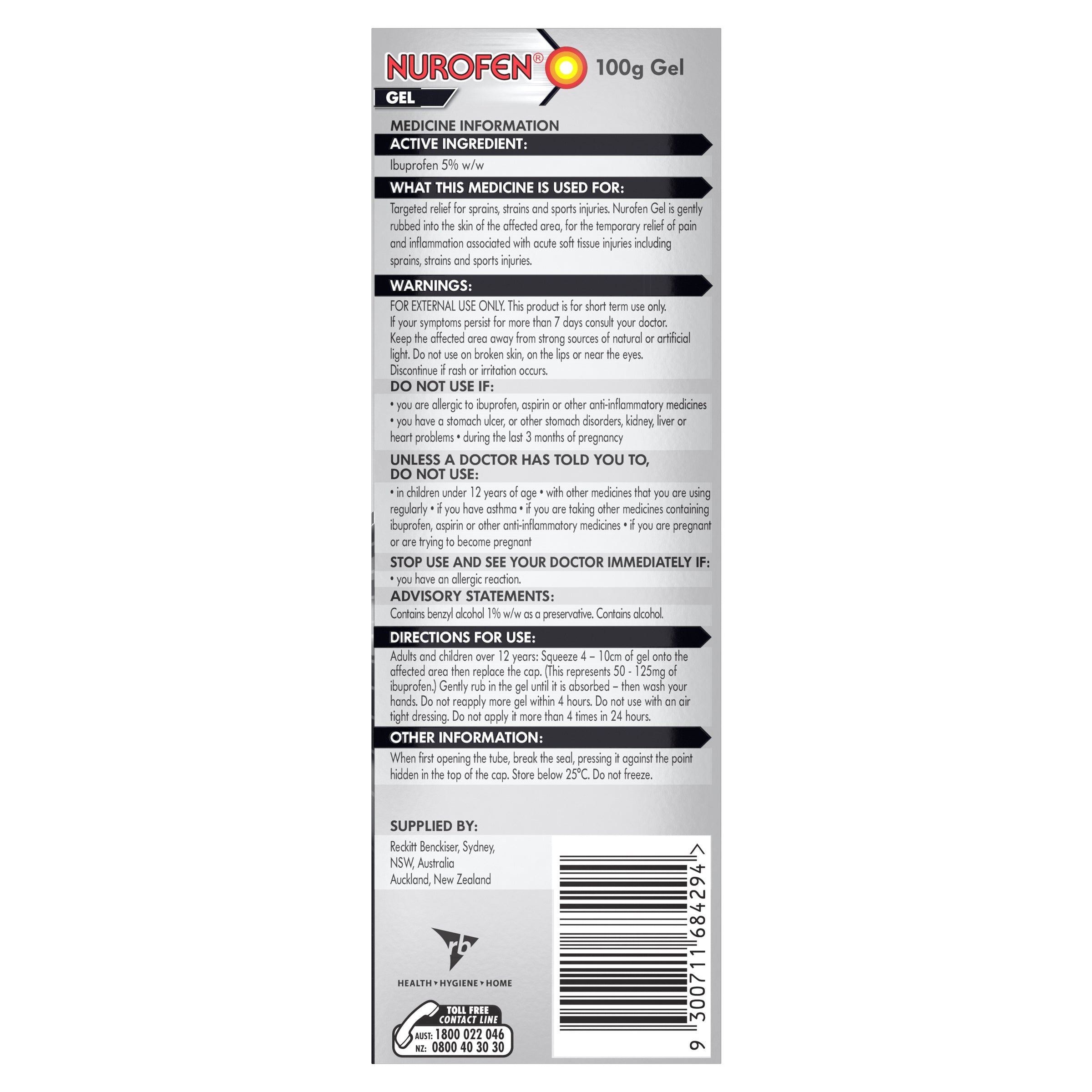 Nurofen Gel 100g provide targeted relief for sprains, strains and sport injuries.With its active ingredient ibuprofen, Nurofen Gel 100g provides effective temporary relief of pain and inflammation associated with acute soft tissue injuries including sprains, strains and sports injuries.