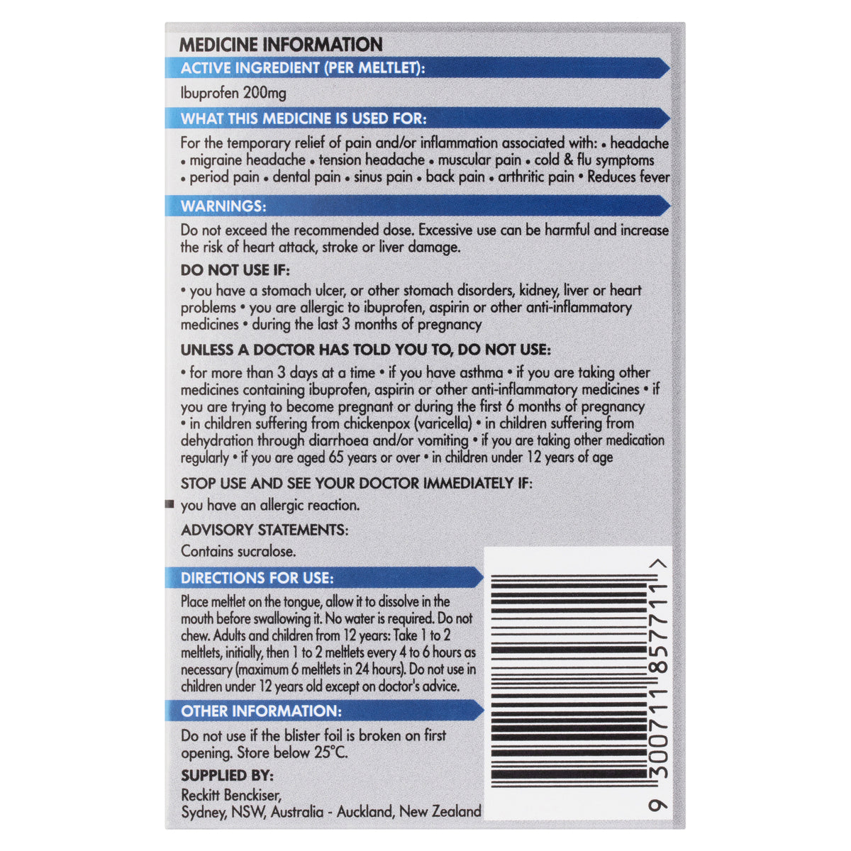 Place melt let on the tongue, and allow it to dissolve in the mouth before swallowing it. No water is required. Do not chew. Adults and children from 12 years: Take 1 to 2 melt lets initially, then 1 to 2 melt lets every 4 to 6 hours as necessary (maximum 6 melt lets in 24 hours). Do not use in children under 12 years old except on doctor's advice.