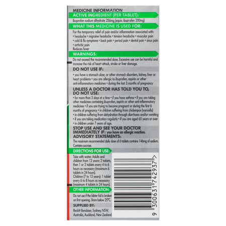 Active Ingredients: Ibuprofen Sodium Dihydrate 256mg (equiv. ibuprofen 200mg).